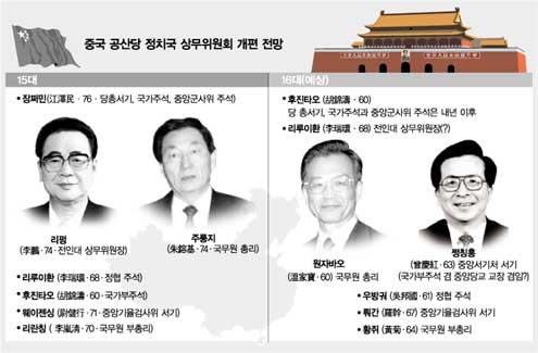 이들 대신에 장 주석과 인연이 깊은 원자바오 부총리와 상하이방인 우방궈(吳邦國·61·이상 정치국원) 부총리, 쩡 전 조직부장(정치국 후보위원)과 황쥐 전 상하이시 서기(정치국원) 등 새로운 인물로 정치국 상무위가 대거 물갈이될 것이라는 관측이다.