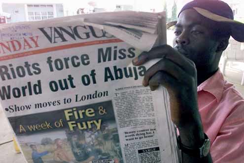이슬람교도들의 폭동으로 미스월드대회가 취소된 나이지리아에서 한 주민이 25일 ‘폭동이 미녀들을 몰아냈다’는 제목이 인쇄된 영자지를 보고 있다.