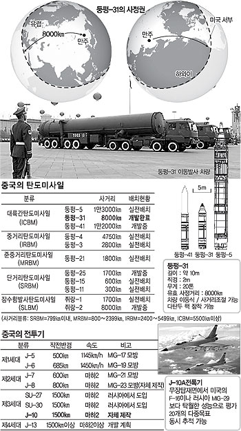 ▽둥펑-31〓중국이 10년만에 개발에 성공한 신형 ICBM 둥펑-31은 유효 사거리 8000㎞로 유럽 대부분과 러시아, 인도 전역은 물론 미국의 알래스카와 하와이, 서부 해안까지 타격할 수 있다. 중국은 둥펑-31의 개발로 핵 전력에 있어서 획기적인 진전을 기할 수 있게 됐다.