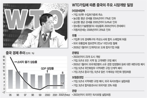 ▽더욱 가혹해질 개방일정〓가입 후 8년 동안 매년 개방약속 이행을 점검 받는 WTO 회원국은 중국 뿐이다. 개방조건이 집요하고 일정 역시 가혹해지는 만큼 중국측의 반발도 예상된다.