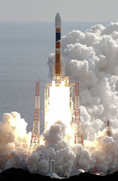 일본이 자체 개발한 로켓 H2A 4호기가 14일 가고시마현 다네가시마 우주센터에서 발사되고 있다. 로켓은 탑재돼 있던 환경관측기술위성(일명 미도리 2호)을 궤도에 성공적으로 진입시켰다. 일본은 지난해 8월 이후 4번째로 로켓 발사에 성공했다.