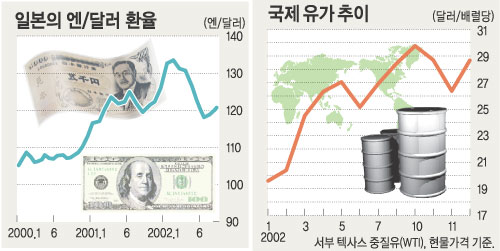 《경제협력개발기구(OECD)의 산업생산지수가 2001년 11월 바닥을 쳤을 때만 해도 올해 세계경기는 살아날 것으로 점치는 목소리가 대세였다. 그러나 상승기에 접어든 지 1년도 지나지 않아 각종 지표들이 경기하강 쪽으로 돌아서고 이라크 사태, 디플레 압력 증가 등이 겹치면서 경기는 매우 불투명해졌다. 국제통화기금(IMF) 등 세계경제 연구기관들은 내년 세계경제 성장률을 올해보다 다소 높은 3%대로 전망했지만 ‘불확실성’을 주요 변수로 지적했다. 세계 경제성장에 25% 정도를 기여하는 미국경제가 여전히 회복세를 자신할 수 없기 때문이다. 3대 주요변수를 중심으로 내년 세계경제를 내다본다.》
