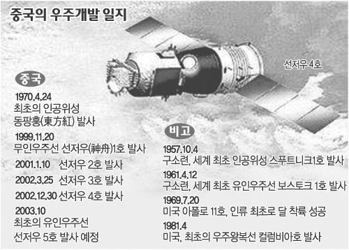 중국 인민일보 자매지 환구시보는 14일 선저우 4호 발사에 얽힌 이 같은 비화들을 소개하면서 “중국은 더 이상 우리의 머리 위에서 다른 나라 위성들이 마음대로 지나다니는 것을 쳐다만 보는 약자가 아니며 이제 이들을 제압할 능력을 갖추게 됐다”고 자부했다.베이징=황유성특파원