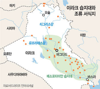 이라크는 겨울 철새인 섭금류(涉禽類·두루미, 물떼새 종류)의 세계 5대 서식지이자 봄 가을에 물떼새 수십만 마리가 찾아드는 중간 기착지. 티그리스강과 유프라테스강을 끼고 있는 이라크 남동부 메소포타미안 습지대(그림 참조)는 조류 수천종의 서식지로 생태계의 보고(寶庫)이자 메소포타미아 문명 5000년의 역사를 이어온 마단(ma'dan) 원주민의 삶의 터전이다.