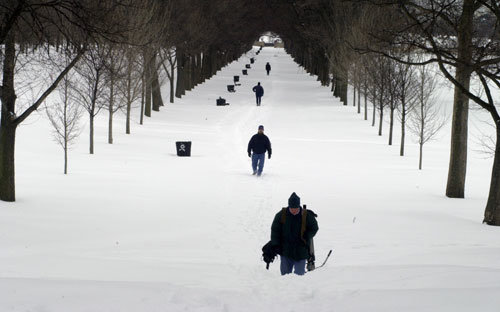 금세기 최대 폭설이 내린 17일 美 워싱턴 링컨 기념관 부근에서 시민들이 눈속을 걷고 있다. 이 폭설로 워싱턴 교통의 대부분이 마비됐다.[AP]