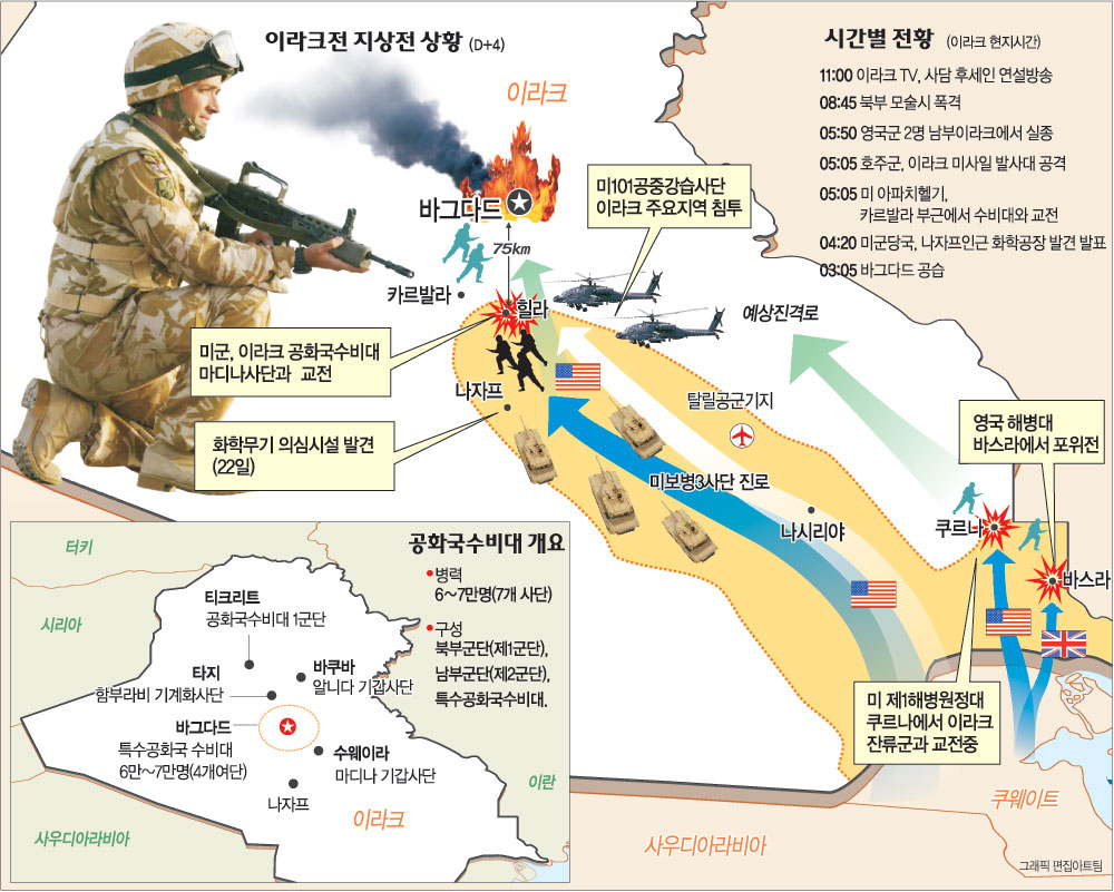 미 국방부는 개전 초기 2, 3일간 “후세인 대통령은 죽거나 부상해 군 장악력을 상실했으며 미군은 특수 공화국수비대와 항복 협상을 벌이고 있다”고 발표해왔다. 가장 충성도가 높은 공화국수비대마저 항복하려 한다는 점도 부각했다.