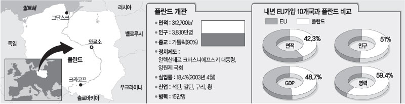 인구 3800만명인 폴란드는 내년 5월1일 EU에 신규 가입할 10개국 가운데 가장 큰 나라. 인구 수에 따라 결정되는 EU의 표결권도 독일 영국 프랑스 이탈리아 다음으로 스페인과 같아 EU 내 목소리도 커질 전망이다.