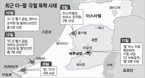 앞서 11일 하마스가 이스라엘 버스에 대해 테러를 가하자 12일 이스라엘 헬기가 하마스 지도자를 공격했다. 이날 팔레스타인의 또 다른 무장세력인 지하드는 요르단강 서안 지구에서 이스라엘군을 공격해 1명을 살해했다. 13일에는 이스라엘 여성 운전자 2명이 요르단강 서안 라말라 인근 도로에서 알 아크사 여단 소속으로 보이는 저격수에게 총격을 받아 중상을 입었다.