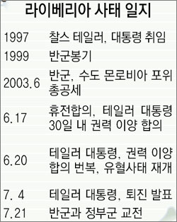 ▽파병 논의=도널드 럼즈펠드 미 국방장관은 홍해 인근지역에 배치돼 있는 4500명의 미 해군과 해병대에 라이베리아 인근 지역으로 이동하라고 지시했다고 미국 관리들이 밝혔다. 미군이 이동하는 데 7∼10일 걸리지만 미국민 소개 등 임무가 부여되면 배치속도가 더 빨라질 수도 있다고 이들은 설명했다.