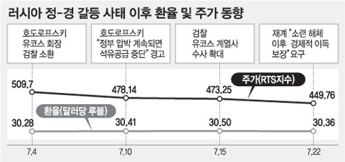 이달 초 플라톤 레베데프 메나테프은행 회장의 구속과 최대 석유재벌인 유코스의 미하일 호도로프스키 회장의 검찰 소환으로 정-경 갈등이 시작된 후 러시아 주가지수인 RTS지수는 지난주 말까지 3주 동안 18%가 떨어졌고 2200만유로(약 300억원)의 자금이 주식시장에서 빠져나갔다.