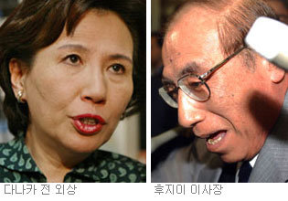 고(故) 다나카 가쿠에이(田中角榮) 총리의 외동딸 다나카 마키코(田中眞紀子·59·여) 전 외상과 정부 산하기관인 ‘일본 도로공단’의 후지이 하루호(藤井治芳·67) 이사장이다.