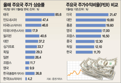 모건스탠리 증권에 따르면 작년 말 대비 세계 50개국 증시의 평균 상승률은 23%에 이른다. 한국의 종합주가지수 상승률은 이보다 약간 높은 26.8%다.