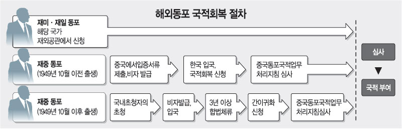 중국 동포는 한국에서만 국적회복을 신청할 수 있다. 이 점이 재외공관에서도 국적회복 신청을 할 수 있는 재미 재일 동포와 크게 다르다. 또 중국 동포는 다른 재외 동포와 달리 본 심사 이전에 사전 심사 절차를 밟아야 한다.