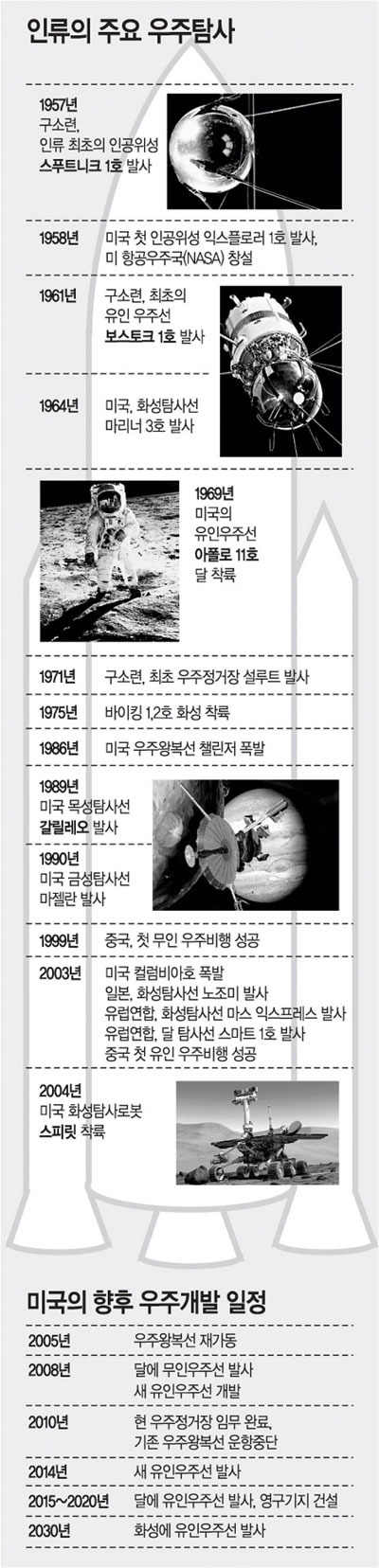 ▽새로운 우주 도전=부시 대통령의 우주계획은 크게 3단계로 나뉜다. 지구와 달을 오갈 수 있는 새로운 비행수단의 개발이 첫 단계. 2008년부터 달에 로봇을 잇달아 보내 표면 탐사 등 기초 작업을 벌이면서 동시에 기존 우주왕복선을 대체할 새로운 개념의 유인탐사선을 개발, 2014년부터는 이를 통해 우주비행사들을 달에 보낸다는 계획이다.