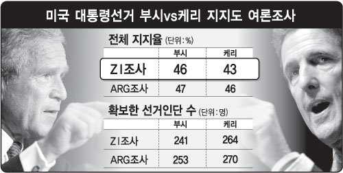 조그비 인터내셔널(ZI)이 17∼19일 실시한 여론조사에서 부시 대통령은 전체 지지율에서는 46% 대 43%로 케리 후보를 3%포인트 앞섰다.