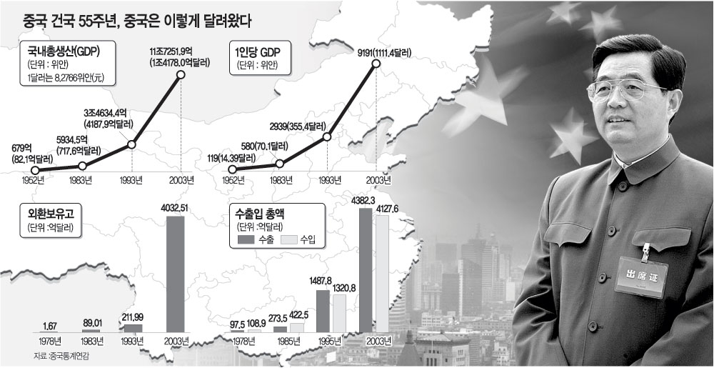 ▽세계경제의 견인차로 부상=중국은 1978년 덩샤오핑의 개혁개방 노선 채택 이후 매년 두 자릿수의 경제성장을 거듭하고 있다. 이제 동아시아에서 일본과 경쟁하고 있고 나아가 미국과 경제패권을 놓고 다투는 지위에까지 올라섰다.