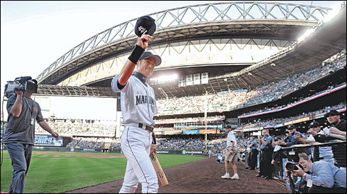 일본의 스즈키 이치로(시애틀 매리너스)가 84년 만에 미국 프로야구 메이저리그의 역사를 새로 썼다. 이치로는 2일 텍사스 레인저스와의 홈경기에서 안타 3개를 몰아쳐 메이저리그 한 시즌 최다안타기록을 경신한 데 이어 3일에도 1개를 보태 시즌 260안타를 기록했다. 종전 기록은 1920년 조지 시슬러가 세운 257개. 이치로가 3일 텍사스와의 경기 전 기념행사에서 받은 세인트루이스 브라운스의 모자를 관중에게 들어 보이고 있다. 세인트루이스 브라운스는 시슬러의 당시 소속팀이다.