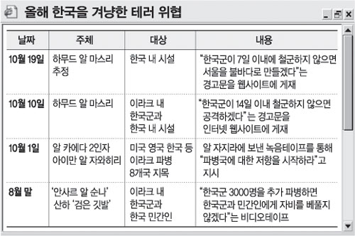 이 같은 지적의 현실화 여부는 차치하더라도 한국에 대한 테러 위협이 증가하고 있는 것은 사실이다. 특히 지난달 22일 자이툰부대 본대 파병이 끝난 이후 테러 위협이 부쩍 늘었다. 10월 들어서만 벌써 3번째다.