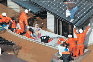 21일 일본 도요오카에서 구조대원들이 지붕으로 대피한 이재민들을 구출하고 있다. -도요오카=로이터 뉴시스