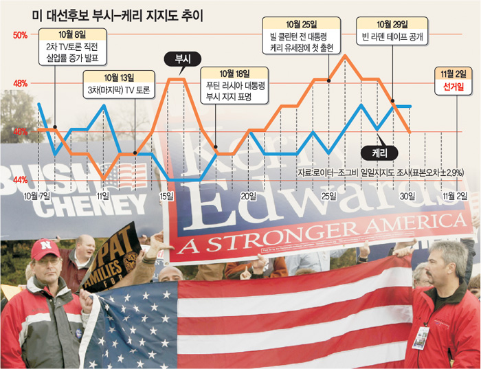 ▽막판 판세=지난달 30일 발표된 여론조사도 기관별로 선두 후보가 달랐다. 부시 대통령은 대체로 46∼49%, 케리 후보는 47∼49%의 지지율을 얻으며 혼전을 계속했다.