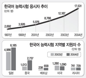 한국어를 모국어로 하지 않는 외국인과 해외동포를 대상으로 한 한국어능력시험 응시자도 급증하고 있다. 1997년 이후 매년 한 차례 국내 4개 지역과 해외 15개 국 43개 지역에서 치러지는 이 시험의 올해 지원자는 1만7531명. 지난해 1만2187명보다 44%가 증가한 수치다. 첫해 2274명이던 지원자 수는 매년 1000여 명씩 늘다가 2002년을 기점으로 수천 명 단위로 뛰고 있다. 이런 급증세는 한류 현상이 뚜렷한 일본과 중국, 베트남에서 특히 두드러진다.