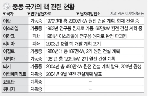 또 이라크와 리비아는 핵 개발을 포기했지만 이란 시리아 이집트 레바논 알제리 등은 연구용 원자로를 가동 중이다. 아랍에미리트도 올해 원전 건설계획을 발표했고 터키는 동결 중인 원전 발전계획을 재추진하는 등 중동국가의 핵 관련 움직임이 활발하다.