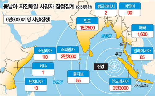 29일 현재 외신들의 집계를 종합하면 각국의 사망자는 인도네시아 3만3000명을 비롯해 스리랑카 2만7000명, 인도 1만7000명, 태국 1700명 등으로 총 사망자는 8만 명에 육박하고 있다.