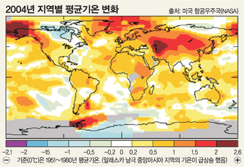 지금까지 지구의 연평균 기온은 1998년이 가장 높았고 2002년, 2003년, 2004년이 2, 3, 4위를 차지하며 계속 높은 추세를 유지하고 있다. 네 번째로 더운 날씨를 보인 지난해 세계 연평균기온은 14도로 1951∼1980년의 평균기온보다 0.48도 높았다. 가장 더웠던 1998년의 연평균 기온은 14.54도.