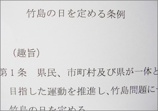 22일 본보가 단독 입수한 ‘의원 제출 1호 의안, 다케시마의 날을 정하는 조례(안)’에 따르면 모두 3조로 구성돼 있다. 1조는 조례의 취지, 2조는 ‘다케시마의 날’을 2월 22일로 정한다는 내용, 3조는 현에 대해 필요한 시책을 강구하라고 촉구하는 내용이다.