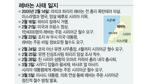외신들은 지난달 14일 라피크 하리리 레바논 전 총리의 피살로 시작된 레바논 사태가 레바논에 머물지 않고 시리아까지 번질 것이라고 전망했다. 미국 시사주간 위클리 스탠더드 최신호는 “레바논 시민들의 ‘백향목 혁명’이 시리아까지 전파될 수 있다”고 전망했다.