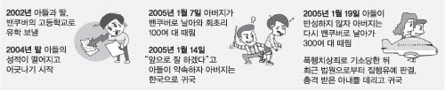 하지만 아버지가 한국으로 돌아간 뒤에도 아들의 일탈은 계속됐다. 귀국한 지 닷새 만인 19일 다시 캐나다로 온 아버지는 3시간 동안 회초리를 들었다. 300여 대. 회초리가 부러질 정도였다. 아들은 엉덩이부터 발목까지 멍이 들어 제대로 앉지도 못했다. ‘회초리 사건’은 아이의 상처를 이상하게 여긴 학교 당국이 경찰에 신고하면서 알려지기 시작했다.