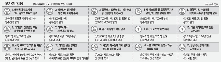 ‘국가 안전 기획 시나리오’라는 제목의 이 보고서가 상정하고 있는 15가지의 악몽 중 △중국발 전염병 유입 △지진 △대형 허리케인을 빼면 나머지 12가지가 테러범들의 공격 수단이나 방법이 될 수 있다고 뉴욕타임스가 16일 보도했다. 그러나 이미 적절한 대응책을 개발한 항공기 공중납치는 여기에 포함되지 않았다. 이 신문은 국토안보부가 당초 이 보고서를 공개할 계획이 없었지만 우연히 보고서 초안이 하와이 주 정부 웹 사이트에 실리는 바람에 공개됐다고 전했다.