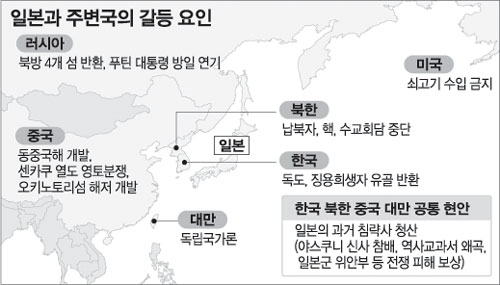일본은 중국과 이 밖에도 야스쿠니 신사 참배와 교과서 문제, 센카쿠(尖閣) 열도 귀속 등으로 사사건건 대립해 양국 정상 교류는 이미 끊긴 지 오래다.
