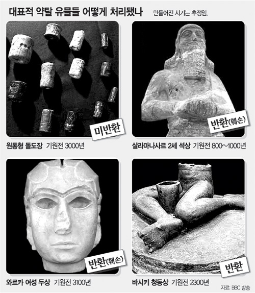 미군이 바그다드로 진격하던 2003년 4월 10일부터 사흘 만에 바그다드 국립박물관은 완전히 약탈당했다. 당시 사라진 유물은 1만5000여 점. 이 중 지금까지 수거된 유물은 5000여 점에 불과하다. 3000점은 이라크 내에서 수거됐고 2000점은 미국 등 다국적군을 파견한 국가들이 돌려줬다. 나머지 1만여 점은 아직 소재가 밝혀지지 않고 있으며 세계 각국의 개인 소장가들의 손에 넘어간 것으로 추정된다.