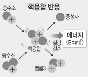 핵융합은 원자력발전의 원리인 핵분열과는 정반대 반응. 수소처럼 가벼운 원소들의 핵이 서로 결합해 헬륨 같은 조금 무거운 원소의 핵을 형성하는 물리현상으로 이때 결손된 질량이 엄청난 에너지로 방출된다. 태양이 에너지를 방출하는 것이나 수소폭탄도 같은 원리다.
