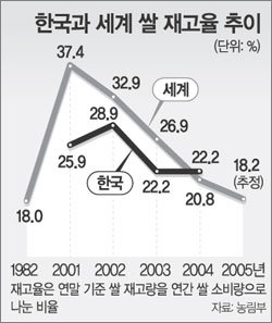 이에 비해 한국의 쌀 재고율은 2002년 28.9%에서 2003년 22.2%로 6.7%포인트 감소한 이래 2년째 같은 수준을 유지하고 있다.