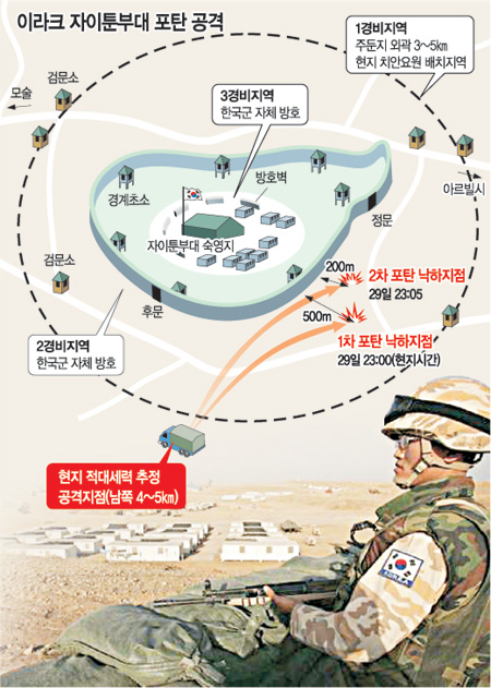 군 관계자는 “곡사포의 경우 최대 사거리가 6∼7km여서 원거리에서도 부대 주둔지에 대한 기습 공격이 가능하다”고 말했다. 이에 따라 자이툰부대의 경계 전력을 강화해야 한다는 지적도 제기되고 있다.