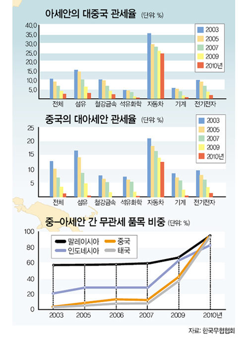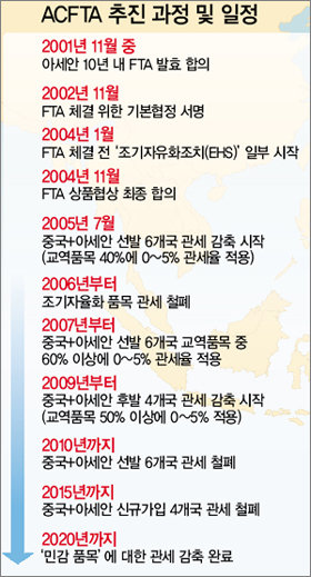 ▽한국 대응책 마련 시급=ACFTA 발효에 따라 역외(域外) 국가로 높은 관세를 부담하는 한국은 이들 지역에서 수출경쟁력이 약해질 전망이다. 한국무역협회는 최근 보고서에서 “중국 시장에서는 석유화학 의류 기계류 등이, 아세안 시장에서는 석유화학 고무제품 철강 등의 분야에서 피해가 우려된다”고 전망했다.
