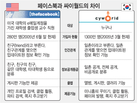 페이스북은 누구나 가입할 수 있는 한국의 싸이월드와 달리 적을 두고 있는 미국 내 대학교의 e메일 계정을 갖고 있어야 한다. 대학 캠퍼스에 국한된 미국판 싸이월드인 셈이다.