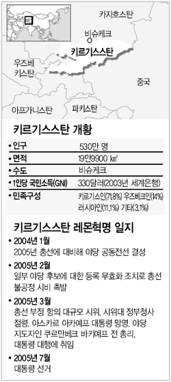 대통령 선거가 치러진 10일 키르기스스탄의 수도 비슈케크는 뜨거웠다. 40도를 넘나드는 불볕더위와 함께 민주화에 대한 시민들의 열망이 거리를 달구고 있었다. 시내에서 마주친 시민들은 아스카르 아카예프 전 대통령의 독재정부를 올 3월 ‘레몬혁명’으로 축출한 것과 이번 선거로 새로운 정부를 구성하게 된 데 대한 자부심이 넘쳤다. 2003년 그루지야의 ‘장미혁명’과 지난해 우크라이나의 ‘오렌지혁명’에 이어 옛 소련지역에서 세 번째로 국민의 힘으로 민주화에 성공한 기록을 세운 것이다.