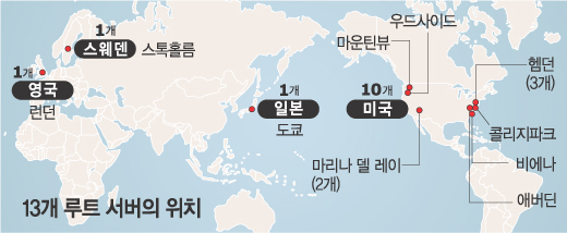 루트 서버는 전화 교환기처럼 사용자의 인터넷 주소와 가려는 인터넷 주소를 인식해 이를 연결하고 관리하는 최상위 컴퓨터. 세계 어느 지역에서 인터넷에 접속하더라도 13개 루트 서버 가운데 하나를 반드시 거쳐야 한다.