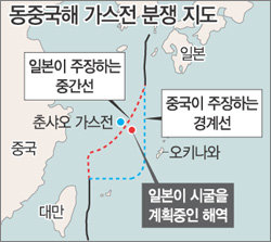바로 이런 동중국해에서 중국이 2003년 8월부터 가스전 개발에 착수하자 일본 정부는 이 가스전이 해저에서 일본 측 EEZ 아래와 이어져 있어 일본 측 가스가 빨려갈 우려가 있다며 개발 중단과 관련 정보 제공을 요구했다. 그러나 중국이 이에 불응하고 양국 공동개발을 주장하자 이번에 자국 민간업자에게도 시굴권을 부여하는 방법으로 정면 대결에 나서게 된 것이다.