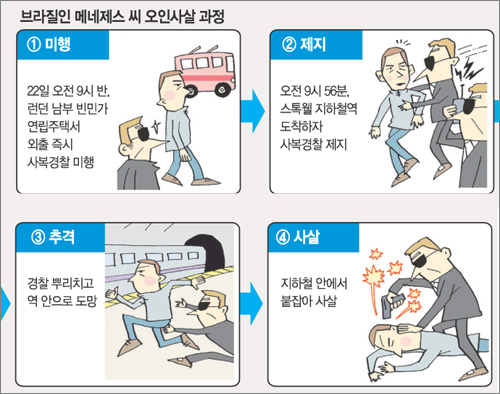 영국 경찰은 전날 7·21 테러범이 남긴 폭발물 꾸러미에서 이 건물 주소가 적힌 서류를 발견했다. 그것이 비극의 발단이었다. 연립주택을 감시하던 경찰은 메네제스 씨가 건물에서 나오자 즉시 미행을 시작했다. 까무잡잡한 피부 때문에 아시아계로 착각한 것.