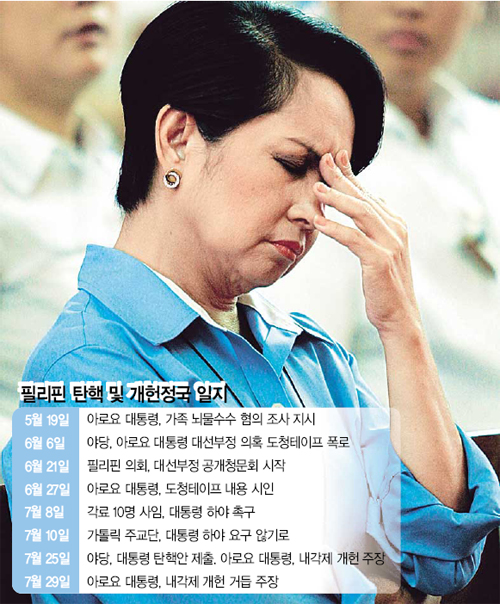 ▽정국 돌파 노림수=야당이 대통령 탄핵안을 제출한 지난달 25일 아로요 대통령은 의회 연설에서 내각제 개헌을 추진할 것을 시사했다. 그는 “미국식 대통령제가 부정부패와 경제부진의 원인”이라며 “대통령이 마음에 들지 않을 때마다 ‘피플 파워’로 축출할 수는 없지 않느냐”고 반문했다. 대통령제 때문에 필리핀이 무정부 상태로 가고 있다는 주장이다.