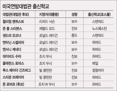 그보다 더 큰 화제는 하버드 로스쿨 출신이 조만간 연방대법원의 판결을 좌우할 수 있게 된다는 점. 미 연방대법원은 9명의 대법관이 다수결로 판결을 정한다. 따라서 5표만 확보하면 판결을 좌우할 수 있는 셈.