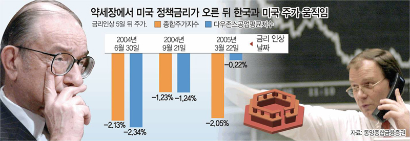 동양종합금융증권 이주형 연구원은 “이번 미국의 금리 인상은 단기적으로 한국과 미국 증시에 조정 압력으로 작용할 것”이라며 “최근 한미 증시 동조화가 더욱 심화하고 있어 금리 인상 직후 한미 주가가 함께 약세 기조를 이어갈 가능성이 높다”고 전망했다.