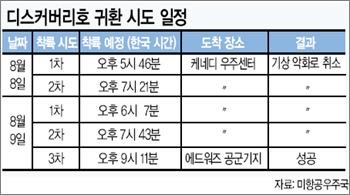 ▽50번째 손님=NASA는 디스커버리호가 케네디 우주센터에 착륙하지 못할 가능성에 대비해 캘리포니아 주의 에드워즈 공군기지와 뉴멕시코 주의 화이트샌즈를 제2, 제3의 착륙장소로 각각 준비시켰다.