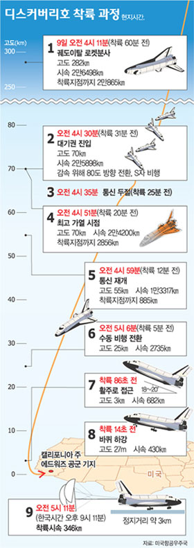 ▽결국 서부로=NASA는 디스커버리호를 플로리다 주 케네디 우주센터로 귀환시키고 싶어 했다. 원래 발사 지점으로 다시 돌아오면 컬럼비아호 폭발 참사 30개월 만에 이뤄진 우주왕복선 성공 신화의 상징성이 더욱 부각되기 때문이다.
