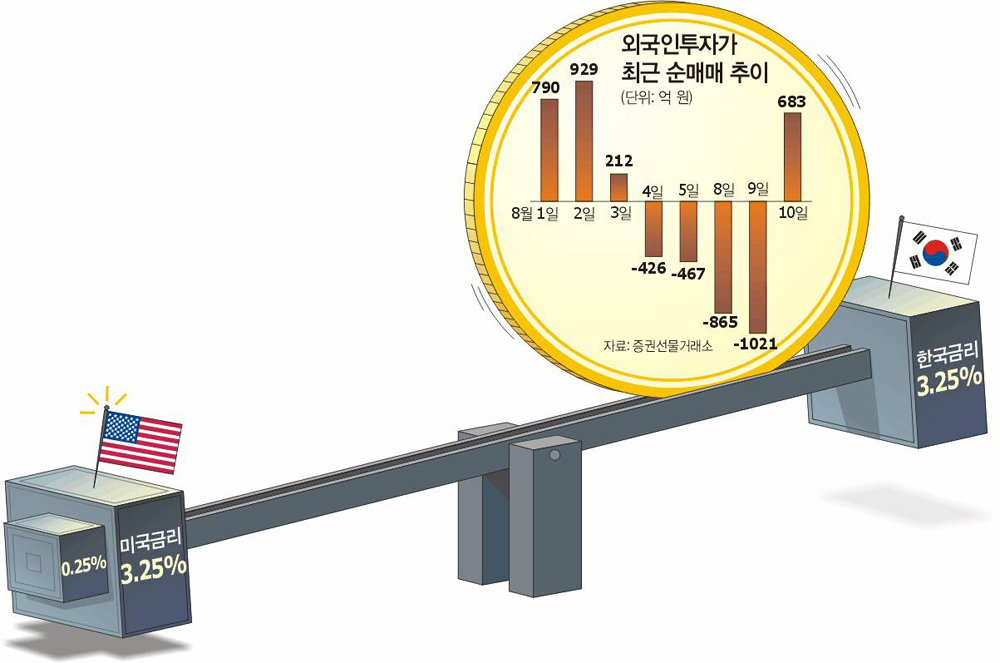 이 결정을 앞두고 외국인들은 9일까지 거래소에서만 4일 연속 순매도(매도 금액이 매수 금액보다 많은 것)하며 약 1800억 원어치의 주식을 팔아치웠다. 막상 금리 인상이 결정된 10일에는 683억 원 순매수로 돌아섰다.
