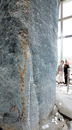 ![]() 2003년 광개토대왕비에 유리 보호각을 설치한 중국 정부가 6월 30일부터 보호각 출입문을 개방했다. 일반 관광객들이 비석 바로 앞까지 자유롭게 드나들고 있으며 발치에는 관광객들이 던져 놓은 동전과 지폐가 어지럽게 널려 있다. 비석 몸통의 갈라진 틈새에 중국 당국이 주입해 놓은 본드가 검붉게 흘러내리며 1500여 년의 풍상을 견뎌 온 비석의 몸통을 더럽히고 있다. 사진 제공 KTF 고구려역사유적답사단